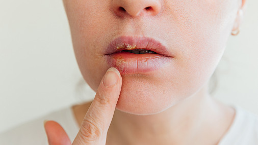 Caused by yeast-like fungi of the genus Candida, candidal cheilitis develops as a result of antibiotic use or a weakened immune system. A characteristic symptom is a whitish coating concealing bright red, inflamed tissue.